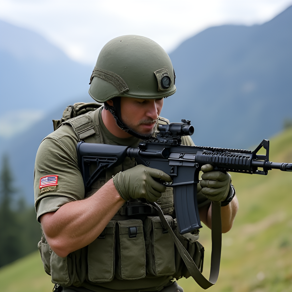 A soldier carefully inspecting their rifle during a training exercise, emphasizing weapon safety and discipline, set against a backdrop of a Swiss mountain landscape.